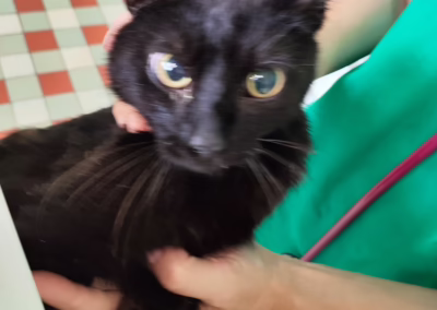 Dnes ráno mi volala nešťastná paní ze Mšece na Rakovnicku, že objevila na zahradě kocourka ve vážném stavu, leží a nehýbe se ale když se k němu přiblíží, kocourek se splaší a snaží se plazit pryč. Bála se jednak aby kocourek někam nezalezl, kde by nebylo možné chytit a i se bála kocourka sama chytat. Tak jsem vyrazila na místo a uviděla jsem chudáčka černého kocourka, jak vyděšeně leží u plotu. Když jsem se přiblížila, snažil se vstát a utéct ale motal se a padal. Na nic jsem nečekala, po kocourkovi skočila a jak jsem ho držela, sice se chvilinku snažil bojovat ale slabé tělíčko ho zradilo, tak toho chudinka nechal a pak už jen odevzdaně nechal, ať s ním dělám co chci. Okamžitě jsem s ním jela na veterinu a kocourek, který dostal jméno Prokůpek prošel během dopoledne rentgenem, sonem a samozřejmě krevním vyšetřením. Při vyšetření očí paní doktorka zjistila, že zorničky reagují pomalu a přiklání se k nějakému autoúrazu. Krve vyšly naštěstí docela v pořádku, trochu zvýšené jaterní hodnoty by mohly ukazovat na nějakou otravu ale uvidíme. Prokůpek dostal infuzi a léky a nyní odpočívá. Čekají ho další infuze a dám mu zkusit něco k papání, případně zkusím dokrmit…. Popravdě, již nemám sílu na další zraněné zvířátko, kapacita útulku je plná a původně jsem chtěla paní ráno odmítnout. Jenže…..nechat ho tam chudinku bez pomoci….. No, prostě už je tady, tak se dáme do společného boje o Prokůpkův život. 🙏🙏🙏