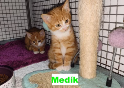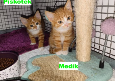 Prckové tam lítají a jsou vyděšení ale nejsou to plašánci. První dva se nechali chytit zrzavobílí kocourci. Jeden chlapeček s bílou šmouhou na hlavičce dostal jméno Piškotek a druhý má jméno Medík.