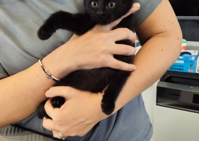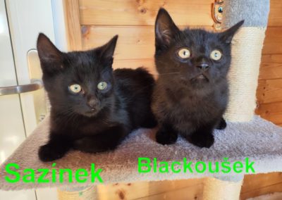 Do Strašeckého depozita pro kočky byla přijata dvě černá koťátka z Lišan na Rakovnicku. Pět koťátek s maminkou se objevilo u krmeného místa a zabydlelo se tam. O celou rodinku se provizorně postarala maminka naší dočasky Katky. Divoká maminka kočička je již vykastrována bude se vracet na místo, kde má dostatek papání a úkryty. Koťátka budou přijata k nám a zatím jsme přijali brášky, kteří dostali jména Sazínek a Blackoušek. Kluci jsou již díky Katčině mamince socializovaní a určitě to budou skvělí parťáci. Jsou jim necelé tři měsíce a jsou skvělí. Dvě sestřičky a brášku budeme přijímat co nejdříve.