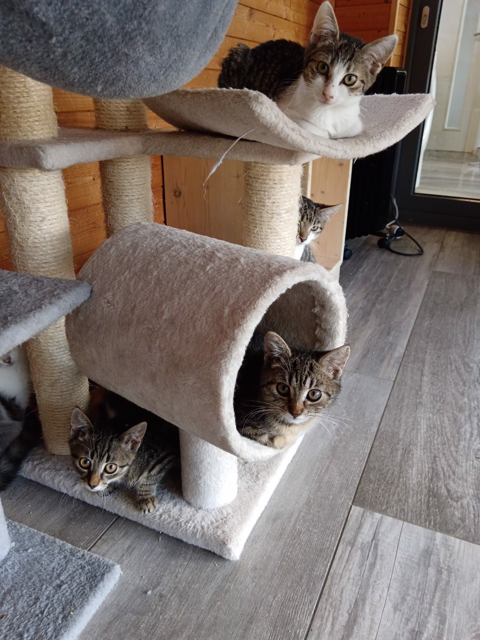 Naši prckové ve Strašeckém depozitu pro kočky – dole moureček Rexík, nad ním moureček Maxík, nahoře bilomourinka Dášenka a vzadu vykukuje její sestřička Danielka. ![]()