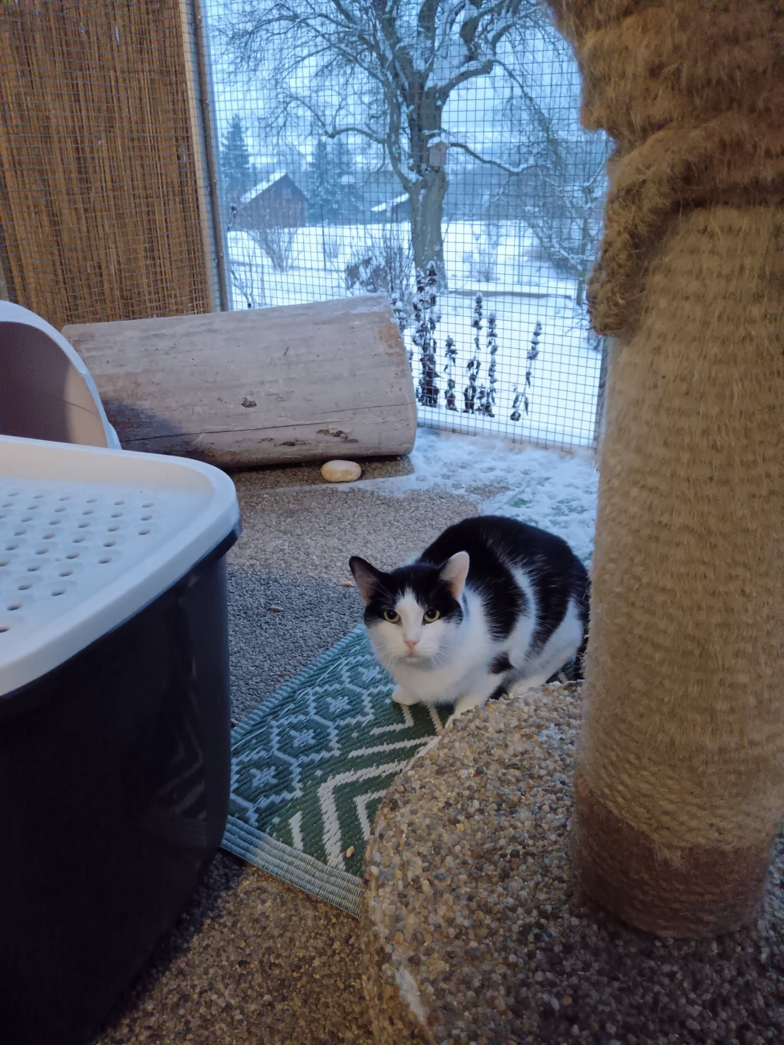Trochu tam máme nasněženo ale kdyby kloučka zábly pacinky, hned si proleze dvířky a je v teplíčku. 😻😻😻