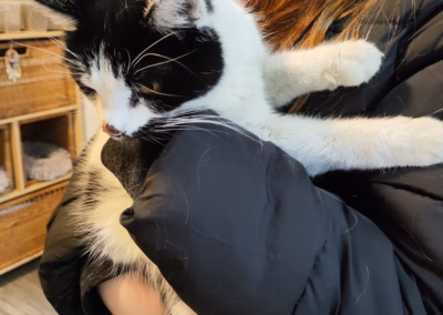 Bíločerná kočička se objevila zhruba před týdnem u hřbitova v obci Tuchlovice na Kladensku. Pobíhala po parkovišti u hřbitova, bylo zřejmé, že se v místě vůbec neorientuje a nezná ho a třásla ze zimou. Lidé bydlící v okolí hřbitova krmí místní toulavé kočičky, ale tuto kočičku tam nikdy předtím neviděli.