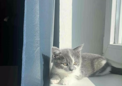 Bejby má v novém domově kočičího kamaráda Šediváčka, který ač sám má přes šest kilo, trošku se ještě torpéda Bejby bojí a je mírně uražen.