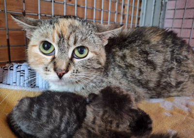 Naše kočička Malvínka, která v pondělí porodila svá čtyři koťátka, bohužel bojuje se zdravotními problémy. Včera na vyšetření u paní doktorky se zjistilo, že Malvínka má zánět mléčné lišty a může kojit pouze ze dvou cecíků. Dostala antibiotika a léky na bolest a aby se zasažená místa lépe sledovala a ošetřovala, oholilo se jí bříško. Dnes už ale vypadá, že mléčko teče jen z jednoho cecíku.