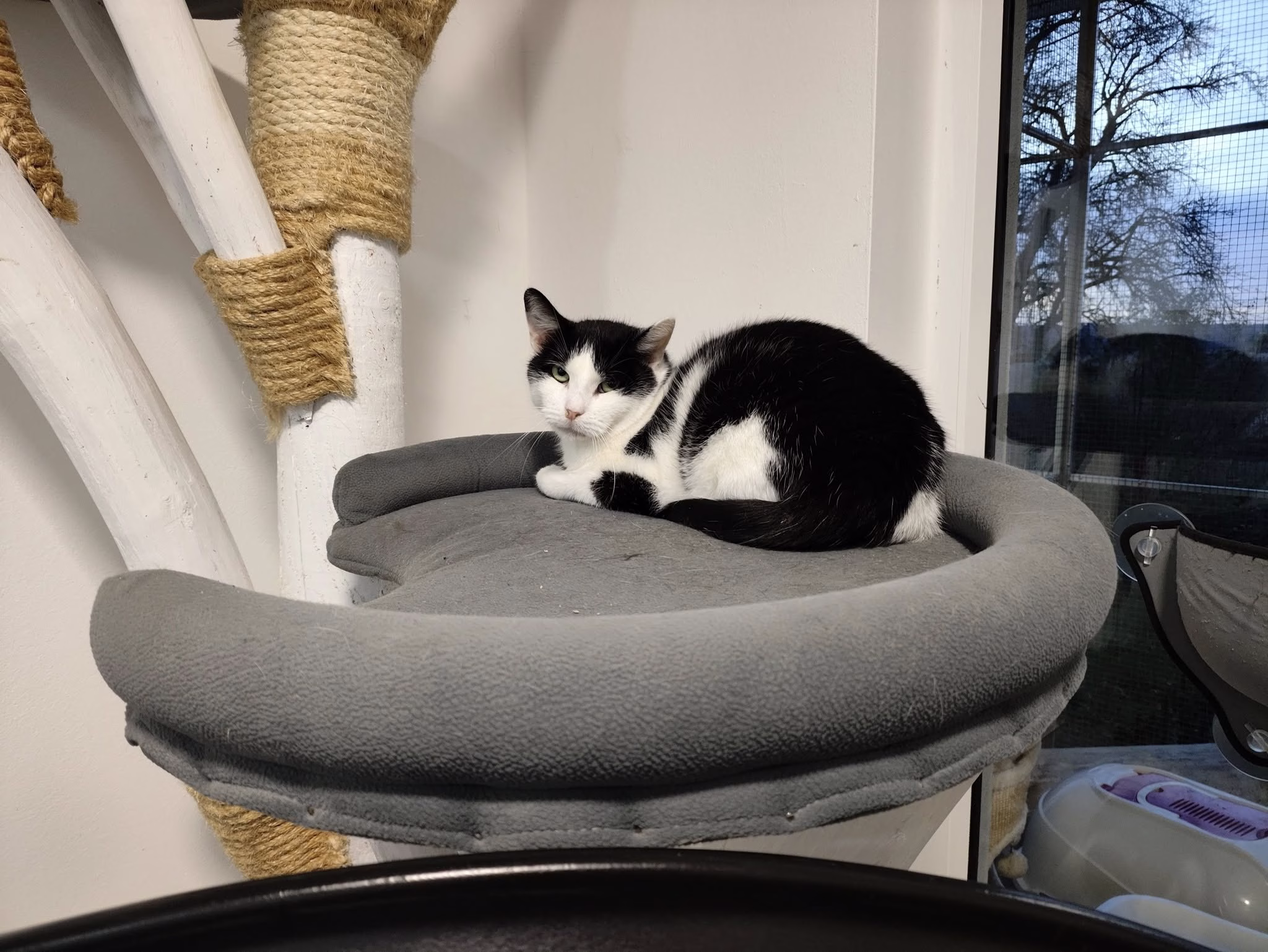 Krásný plašánek Žihadýlko ze Strašeckého depozita pro kočky lenoší na škrabadýlku a venku se stmívá…..✨🌛✨
